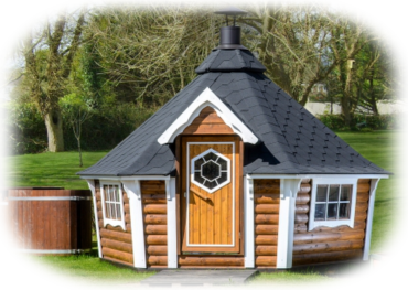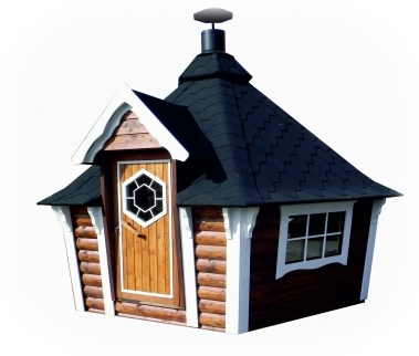 Dachfarbe schwarz, rot oder grün, 45mm Rundbohle, umlaufende Bänke, geschl. Fussboden, inkl. Polster, inkl. kompletter Grillanlage mit 6 Einhängetischen, inkl. Klapptische, Esse, Schornstein (höhenverstellbar), 3 Stativen mit Grillrost und Regenhut, 3 Fenster, davon 1 zu öffnen,Lieferung Europaweit (ausser Inseln), inkl. Niroeintrittstufe und Türstopper für Winschläge