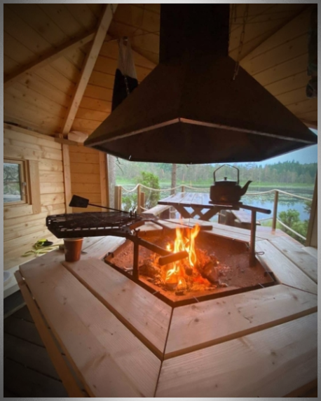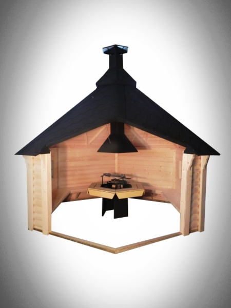 - Grillanlage mit Kochplattformen und Tischen rund um den Grill;