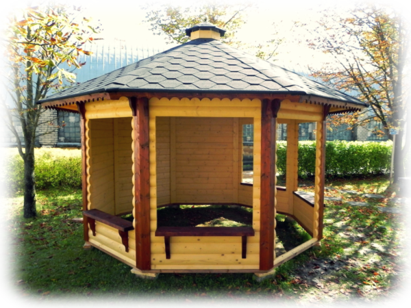Dachfarbe schwarz, rot oder grün, 45mm Rundbohle, ohne Fussboden, 3 geschlossene Wände, 4 offene, ohne Fenster, ohne Grillanalge, Lieferung Europaweit (ausser Inseln),