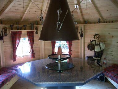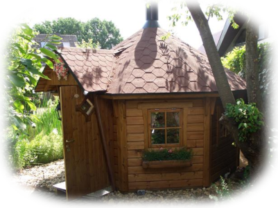 Eine Kota der besonderen Klasse. Dach schwarz, Glattbohle 45mm Kiefer. Hier sind alle 7 Fenster zu öffnen, ausgestattet mit Granittischplatte, 3 Schlafbänken,Grillpfanne und Teepott